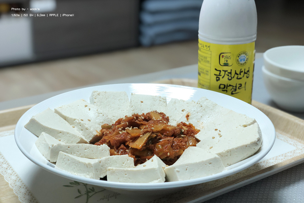 저녁 겸 야식으로 두부김치에 금정산성 막걸리를 곁들였습니다.