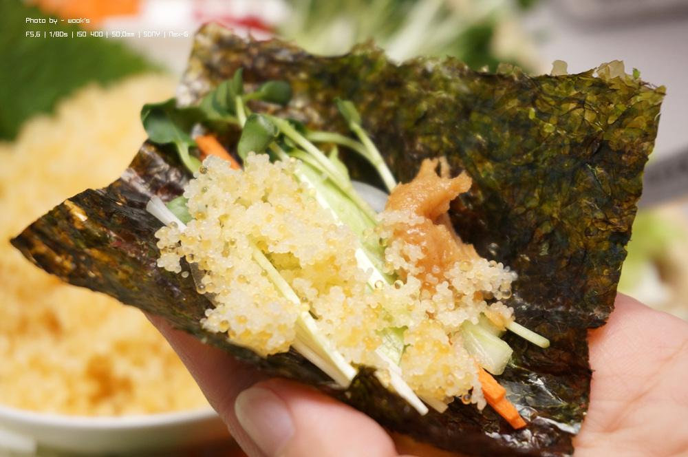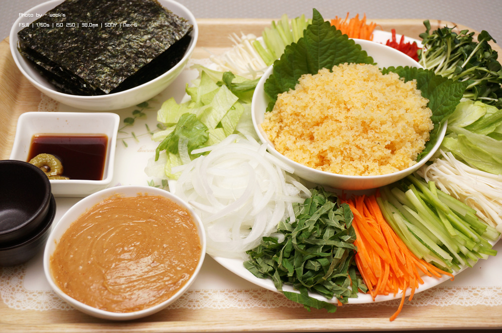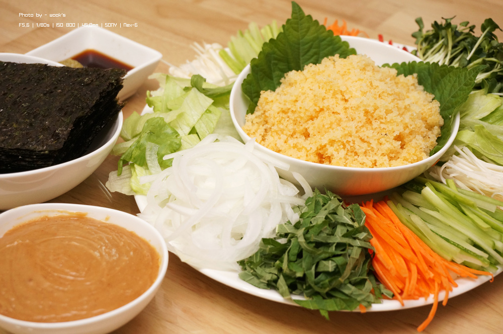 날치알과 채소들을 땅콩크림에 곁들여 김에 싸먹는 맛이 일품입니다. -ㅂ-)b
