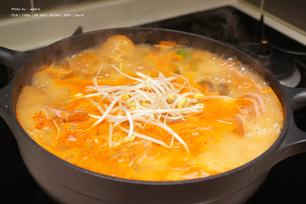 부대찌개에 많이 넣는 콩(캔)이나 잘게 썰은 김치, 어묵 정도 추가해주면 좋습니다. ^^
