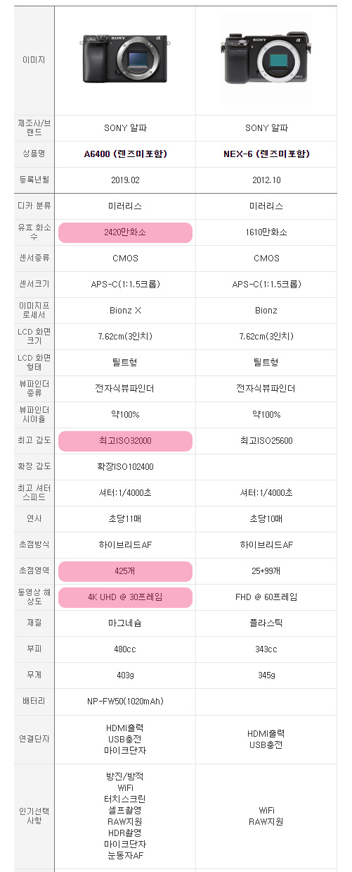 A6400과 NEX-6의 사양 비교표.