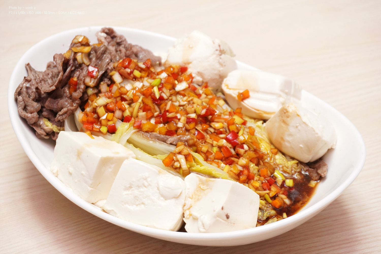 | 연두부 알배추 간장소스 얇게 썬 고기 |
