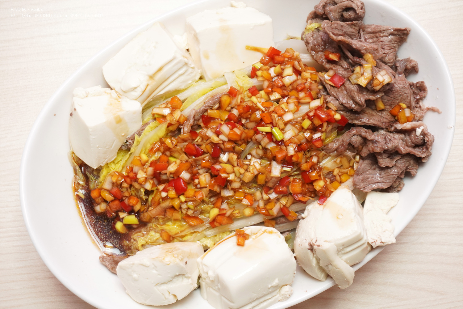 | 연두부 알배추 간장소스 얇게 썬 고기 |